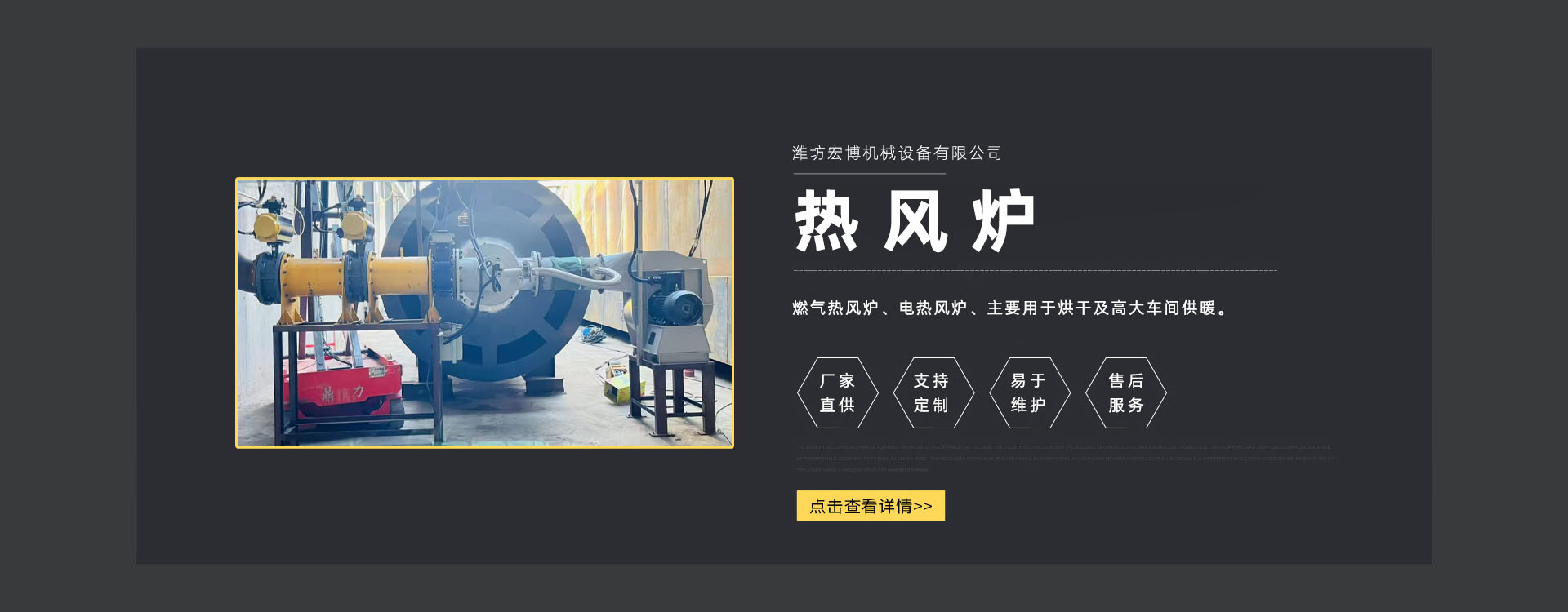 濰坊宏博機械設(shè)備有限公司是從事熱風爐、烘干設(shè)備、供暖設(shè)備的研發(fā)、設(shè)計、制造和服務(wù)于一體的實體企業(yè)。長期以來,企業(yè)以市場的發(fā)展和客戶的需求為導向,集多年的生產(chǎn)技術(shù)與經(jīng)驗為一體,不斷開發(fā)和優(yōu)良產(chǎn)品。